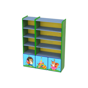 Открытый стеллаж с выкатными ящиками для игрушек, книг, пособий и др. Состоит из двух частей. Возможно отдельное расположение секций стеллажа (узкой и широкой). Выполнен из ламинированной ДСП (ЛДСП) 16 мм, края обрамлены кантом ПВХ 2 мм. Цвет на выбор.