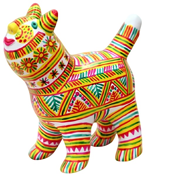 Технология создания игрушки всегда поэтапная: лепка, обжиг, роспись. Благодаря светлому оттенку глины, игрушку не нужно было грунтовать, и роспись наносилась сразу поверх глины. Животные, также как этот кот, расписывались разноцветными полосками вдоль туловища и шеи.