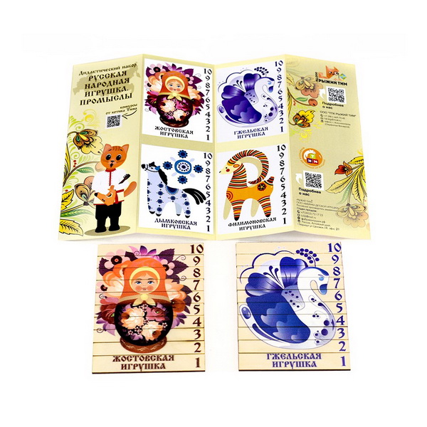 Дидактический набор состоит из 12 плашек с изображением русских народных игрушек. Каждая плашка разделена на 10 частей . В состав набора входит наглядный материал для сборки плашки.
