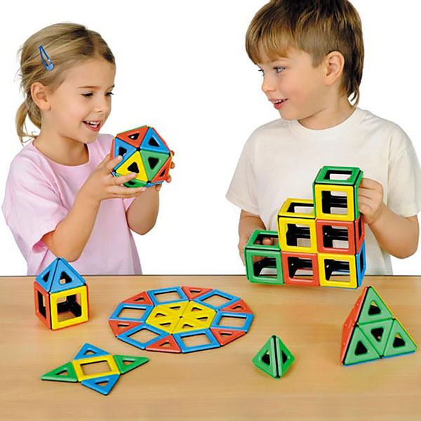 Магнитный конструктор, который состоит из квадратных и треугольных элементов необычной формы.