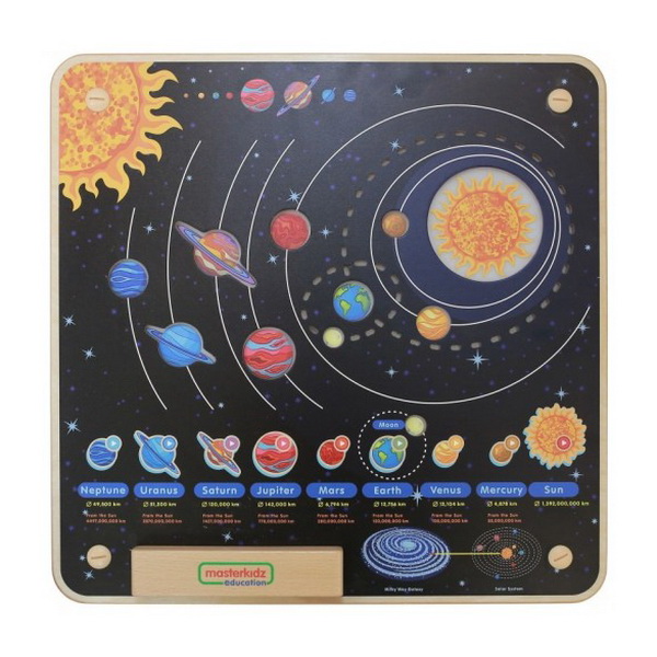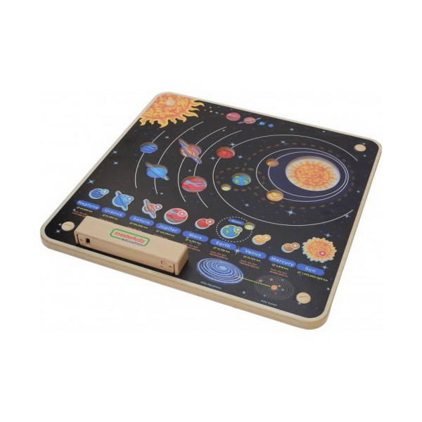Основание настенной панели выполнено из березовой фанеры, а на лицевой части изображена солнечная система. Специальные световые эффекты демонстрируют движение планет. Вокруг изображений Земли и Луны светодиодами выполнена их орбита.