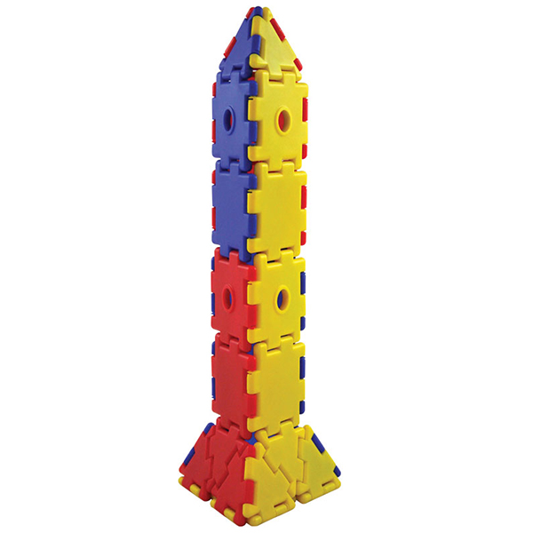 45 треугольников, 45 треугольников с отверстиями, 90 квадратов, 90 квадратов с отверстиями, 36 колец, 12 колёс, 18 осей, 18 детских фигурок и 18 фигурок взрослых.